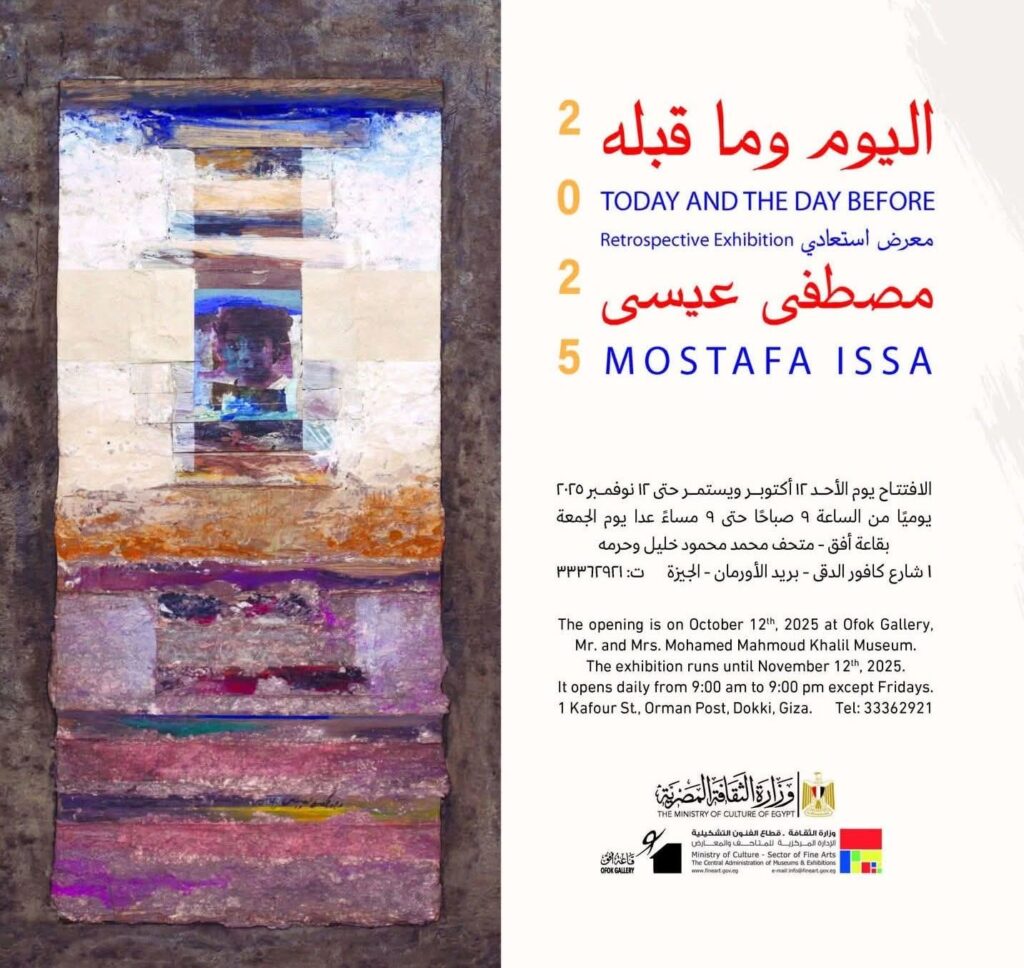 Under the patronage of Prof. Dr. Ahmed Fouad Henn, Minister of Culture, and Prof. Dr. Walid Qanoush, the retrospective exhibition of the great artist Mostafa Eissa will be inaugurated under the title “Today and the Day Before” at 7:30 PM on Sunday, October 12, 2025, at Afaaq Hall 1.